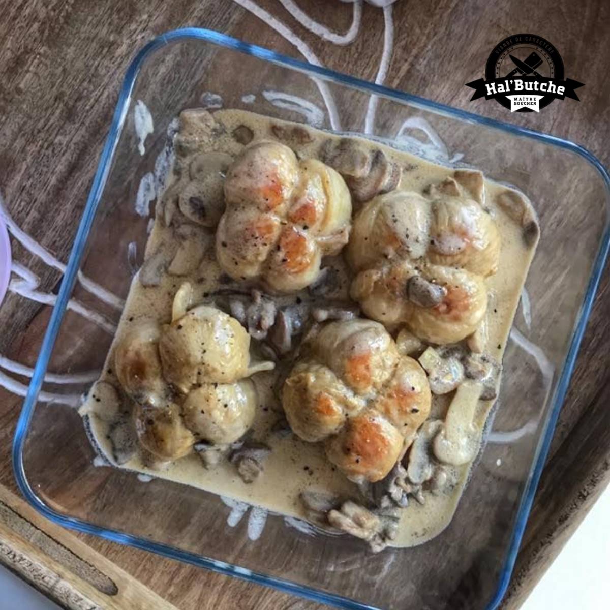 La paupiette Royale halbutche vous donnera entière satisfaction, avec sa cuisse de poulet désossée et farcie de notre mélange de veau haché, foie de volaille, brioche le tout lié avec du lait.